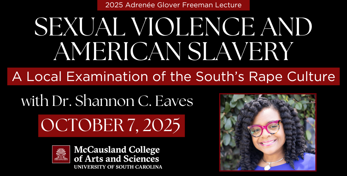 The lecture, “Sexual Violence and American Slavery: a Local Examination of the South’s Rape Culture" will be held at 1705 College Street, Columbia, SC in the Close-Hipp Eastview Room (8th floor) on Tuesday, October 7th from 6-7:30 PM.